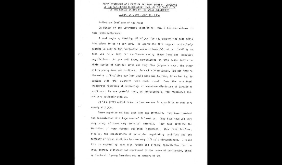 Press Statement of Professor Akilagpa Sawyerr, Chairman of the Government Negotiating Team, on the Conclusion of the Renegotiation of the VALCO Agreements